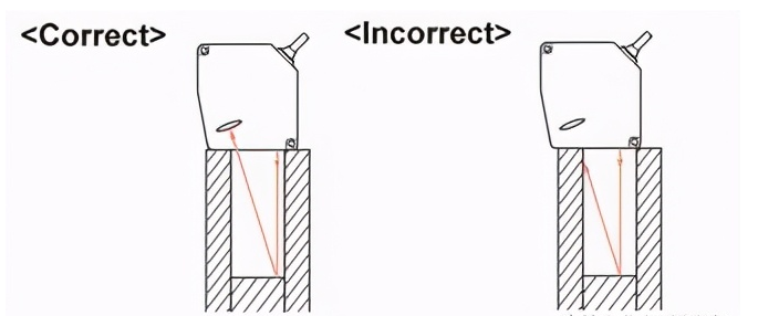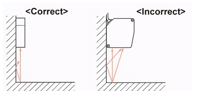 如下所示安裝傳感器,以防止多束反射光線進(jìn)入墻壁上的接收部分。另外,在壁的反射率高的情況下,使用非光澤的黑色壁是有效的。