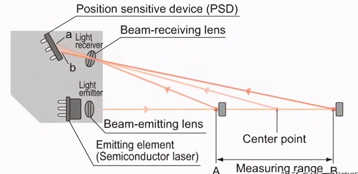 激光位移傳感器測(cè)距的原理,其中一種方法是通過(guò)組合發(fā)射元件和位置敏感器件(PSD)進(jìn)行三角測(cè)量以執(zhí)行測(cè)距(檢測(cè)位移量)。