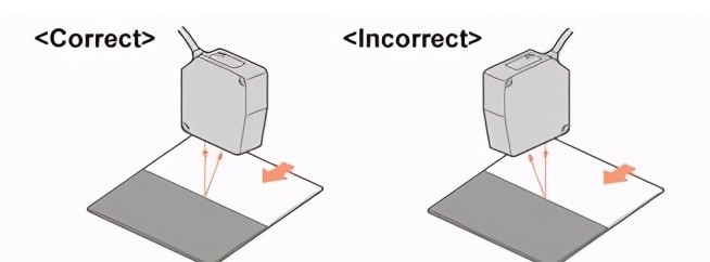 對(duì)反射很少光的黑色物體執(zhí)行位移測(cè)量時(shí),分辨率會(huì)降低。這是因?yàn)樵诮邮詹糠譁p少了光量,并且從PSD接收的信號(hào)變小。在這種情況下,請(qǐng)如下圖所示安裝傳感器,以增加接收到的光量。
