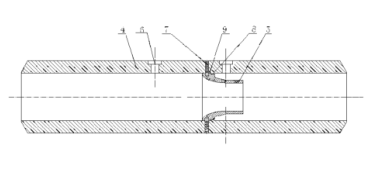 本實施例中的連接件7為銷子,當然連接件7還可以為螺釘等其他連接件。長徑噴嘴5裝配好后再鉆銷子孔(須配合銷子鉆),且銷子與長徑噴嘴要過盈配合,才能更好的保證長徑噴嘴與工藝管道的同軸度。