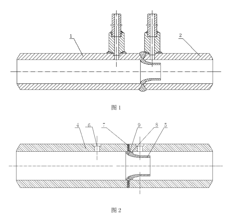 如圖2所示,本實用新型提供了一種差壓式長徑噴嘴安裝結構,包括工藝管道4和長徑噴嘴5,以及位于長徑噴嘴5兩側的測量孔6,長徑噴嘴5設置于工藝管道4的內部,測量孔6設置在工藝管道4的側壁上:其中,工藝管道4為一體式直管道,長徑噴嘴5通過一連接件7與-體式直管道連接。