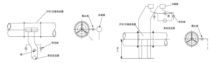 (2)差壓變送器最好安裝在內錐體裝置的下方,這樣可以避免氣體進入導壓管和變送器中。冷凝器應安裝在盡可能量靠近內錐體裝置處。