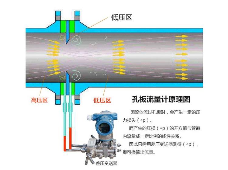 充滿管道的流體,當它們流經管道內的節流裝置時,在節流件附近造成局部收縮,流速增加,在其上、下游兩側產生靜壓力差,根據能量守衡定律和流動連續性定律,用壓差測量檢測出流體流量。
