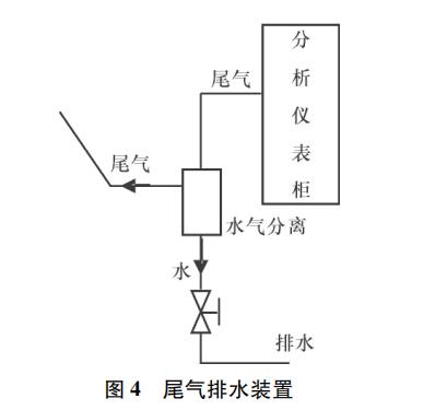 在儀表柜旁增設尾氣排水裝置. 如圖 4 所示,在尾氣排放管的低處加裝一個沉降器和排污閥,當此處有水產生時,由于重力作用,水會自動流入下方的沉降器,而氣體則由上方排空。只要定時排放沉降器中的水,就可保證分析儀的安全運行。